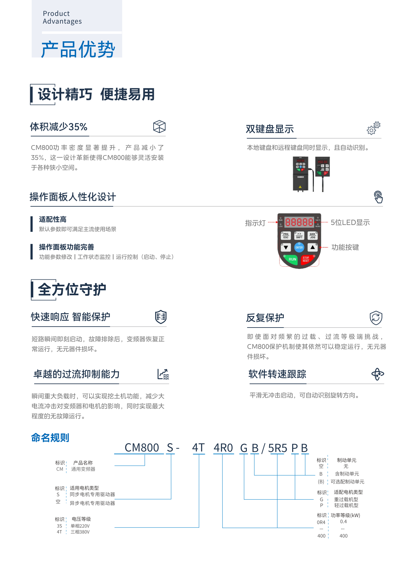 CM800系列是一款全新开发的小体积大功能紧凑型控制变频器,具有转矩响应快、稳速精度高、调速范围宽、高防护性能等显著优势。可广泛应用于以玻璃、食品灌装、医药离心机、自动化生产线、电子设备、物流设备、陶瓷设备、机床主轴、纺织等为代表的自动化机械设备场合。