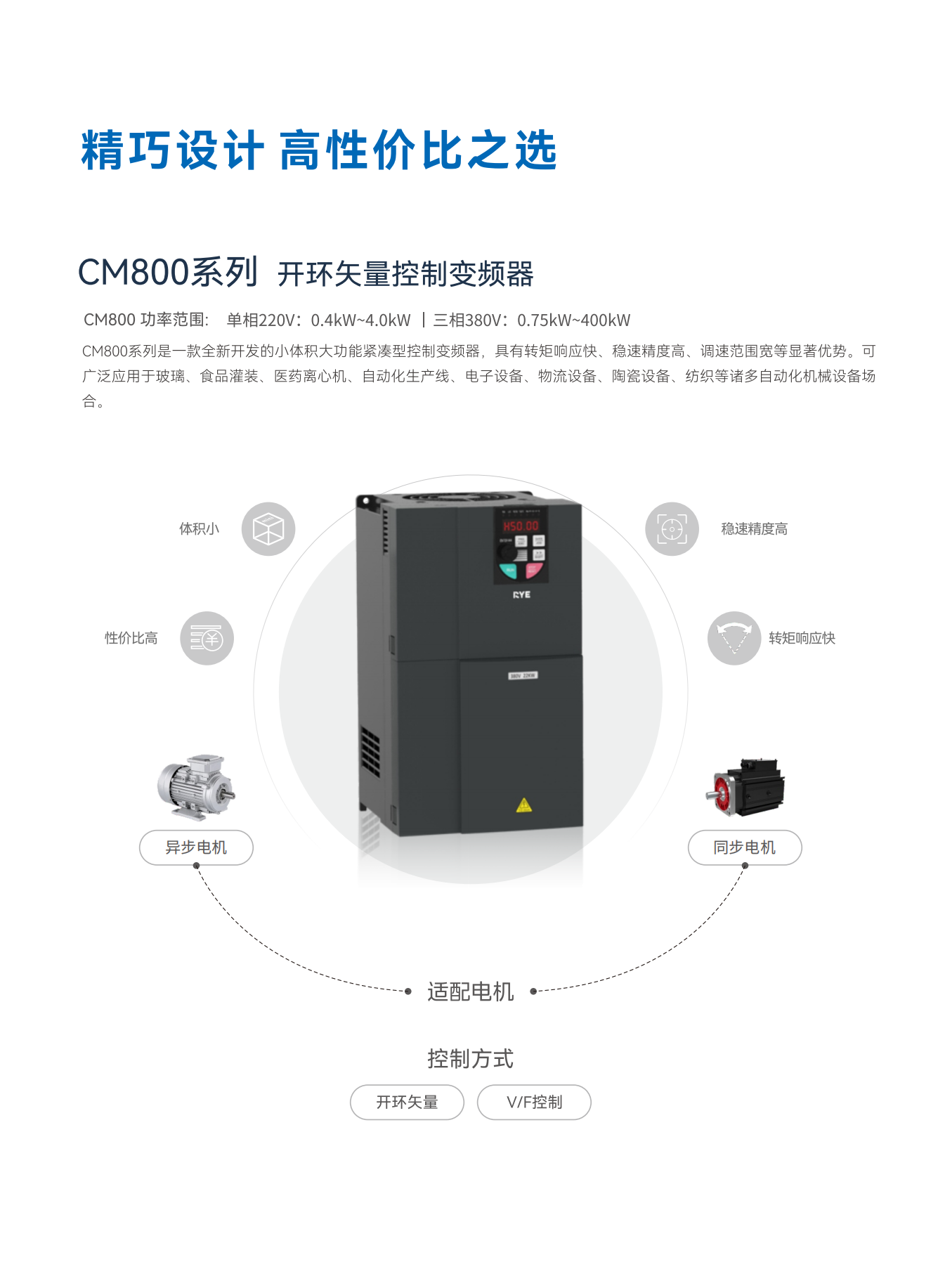 CM800系列是一款全新开发的小体积大功能紧凑型控制变频器,具有转矩响应快、稳速精度高、调速范围宽、高防护性能等显著优势。可广泛应用于以玻璃、食品灌装、医药离心机、自动化生产线、电子设备、物流设备、陶瓷设备、机床主轴、纺织等为代表的自动化机械设备场合。